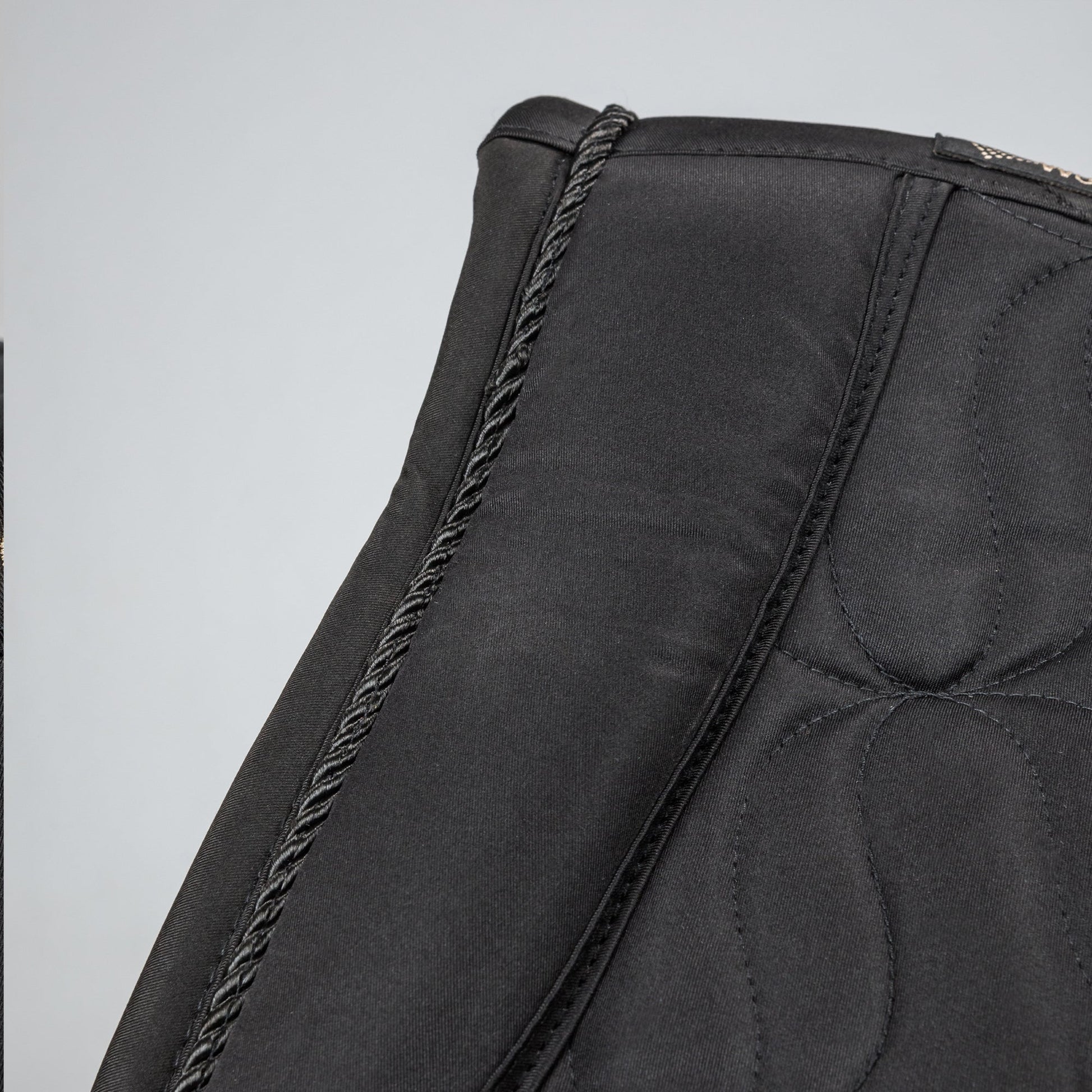 Deep Nights är ett sofistikerat hoppschabrak, helt i glänsande svart med svart utsmyckning och ett quiltmönster som utgörs av vårt signum; Back on Track-vingarna. Prydd med ett diskret emblem i matt guld på sidan.