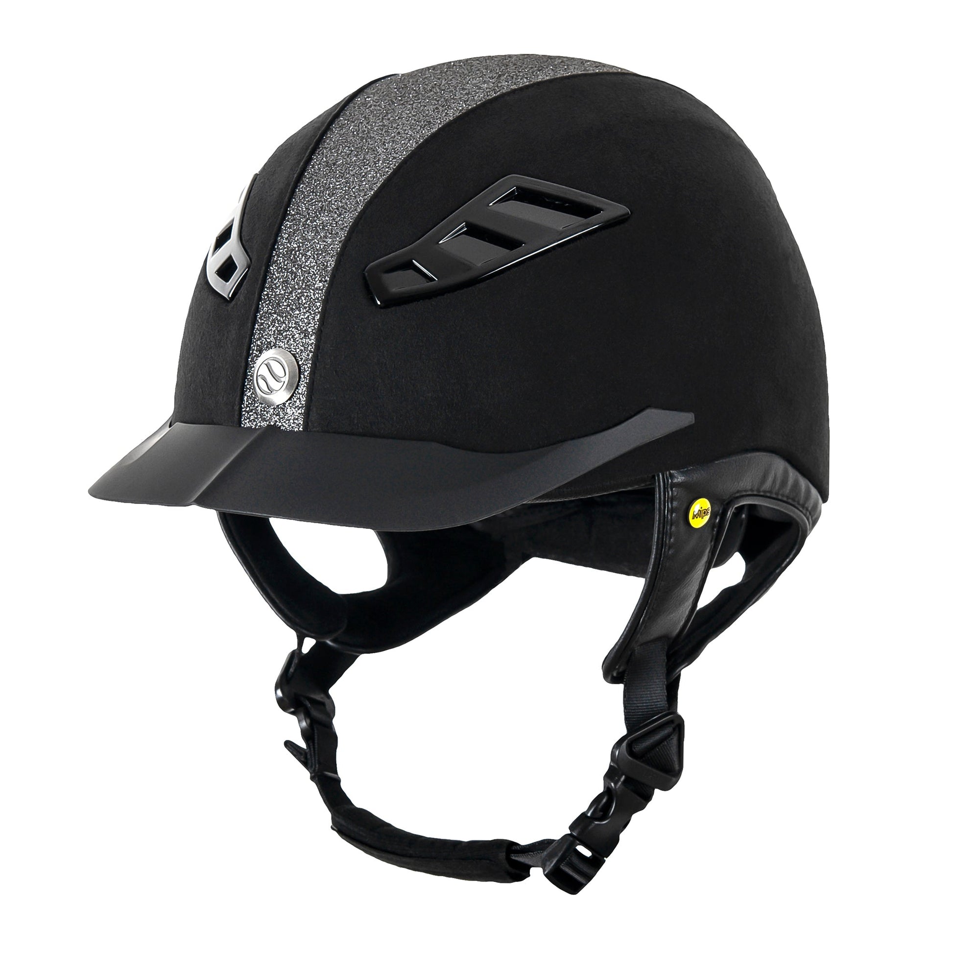 Hjälmen har en snygg design, klädd i svart micromocka med en mittdel i elegant svart glitter. Ventilationshål på både fram- och baksidan håller dig sval och bekväm. Linern (innerfodret) har vår Coolmax®-teknologi som transporterar bort fukt och ökar komforten ytterligare. Fodret är avtagbart och kan enkelt tvättas rent med ljummet vatten.