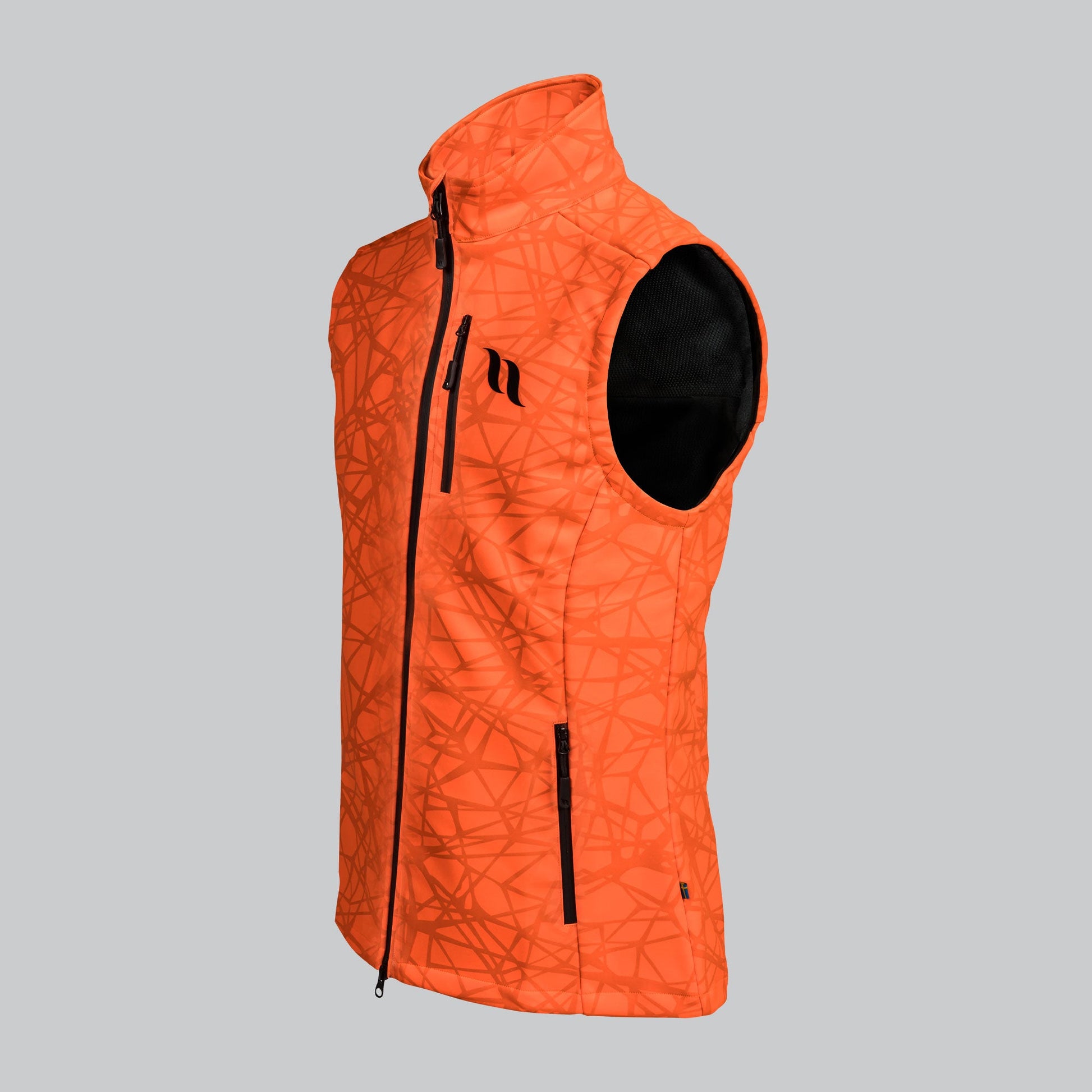 Tunn, smidig och vattenavvisande herrväst med kroppsnära passform, designad för maximal rörelsefrihet. Västen pryds med ett reflekterande mönster och reflexdetaljer. Den klart lysande orangea färgen sticker ut och gör dig lättare att upptäcka i naturen.