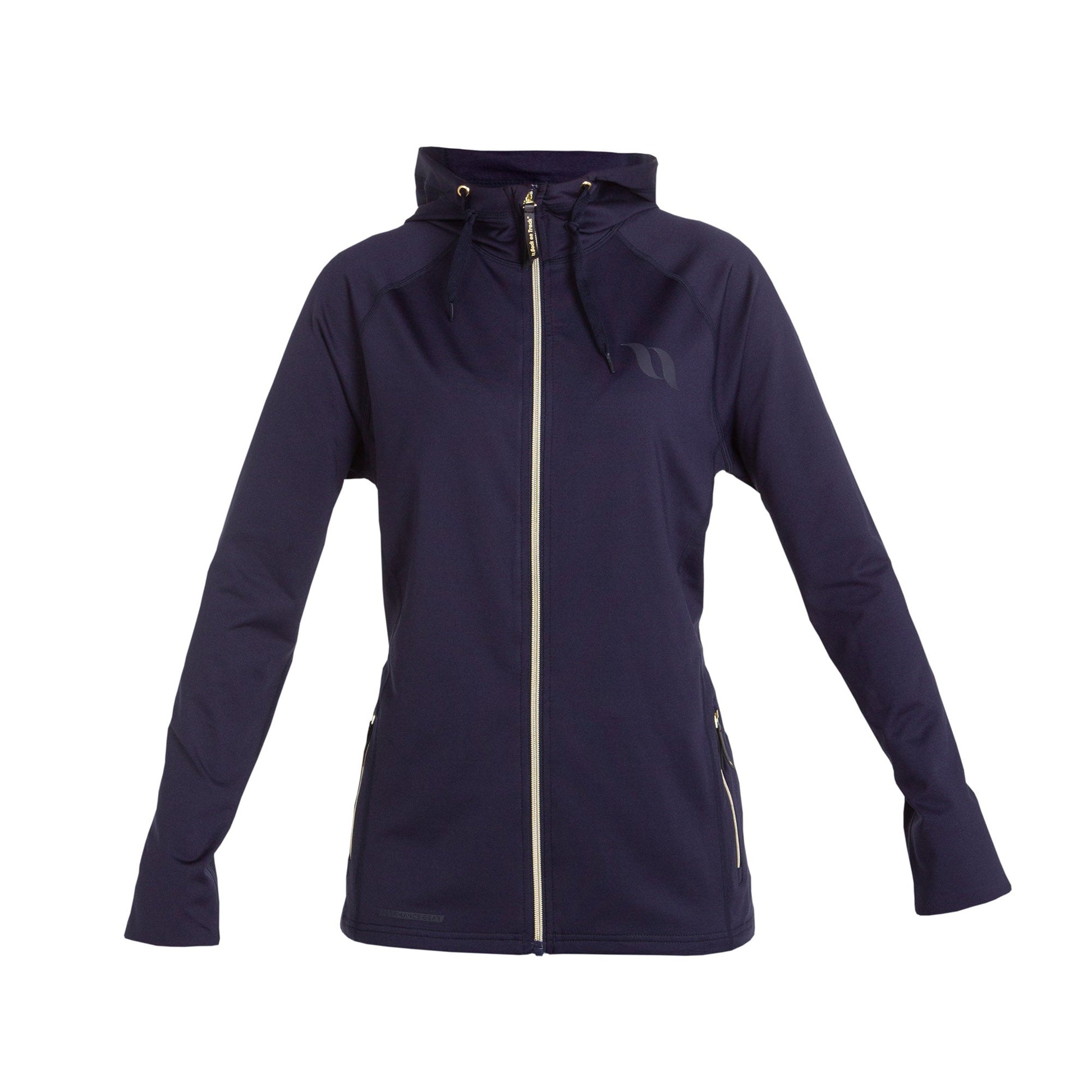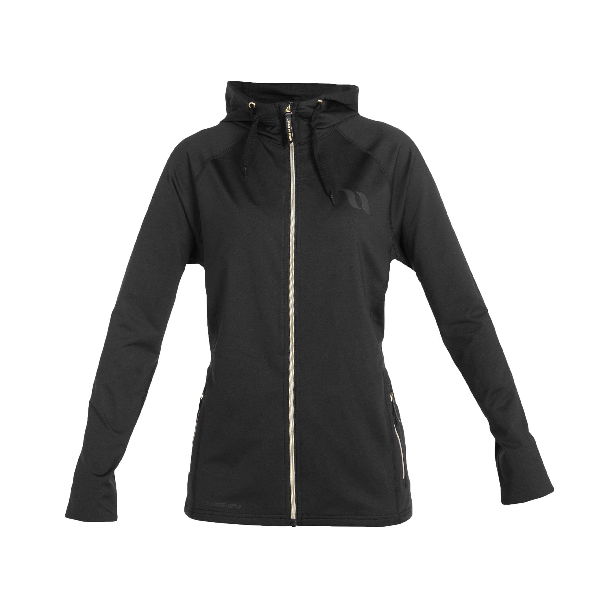 Tröjan är svart med en guldfärgad dragkedja framtill och två fickor med dragkedjor på sidorna. Huva med nära passform och dragsko för optimal effekt av Iontex®-teknologin i nackpartiet. Tillverkad i ett mjukt, exklusivt tyg av hög kvalitet med en figursydd design som gör att den känns både elegant och sportig.