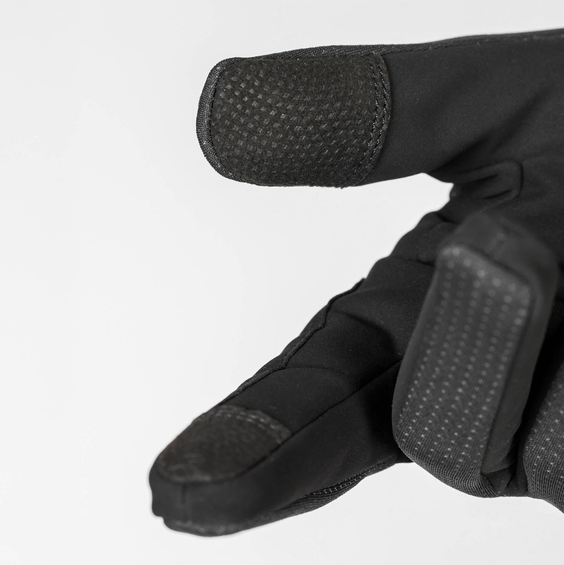 Insidan av handen täcks av ett matt, sammetsmjukt material som skapar en högre friktionsyta och hindrar greppet från att glida. Utsidan av pekfingrar och tummar är strategiskt förstärkta med samma material för att motverka slitage från tyglarna.