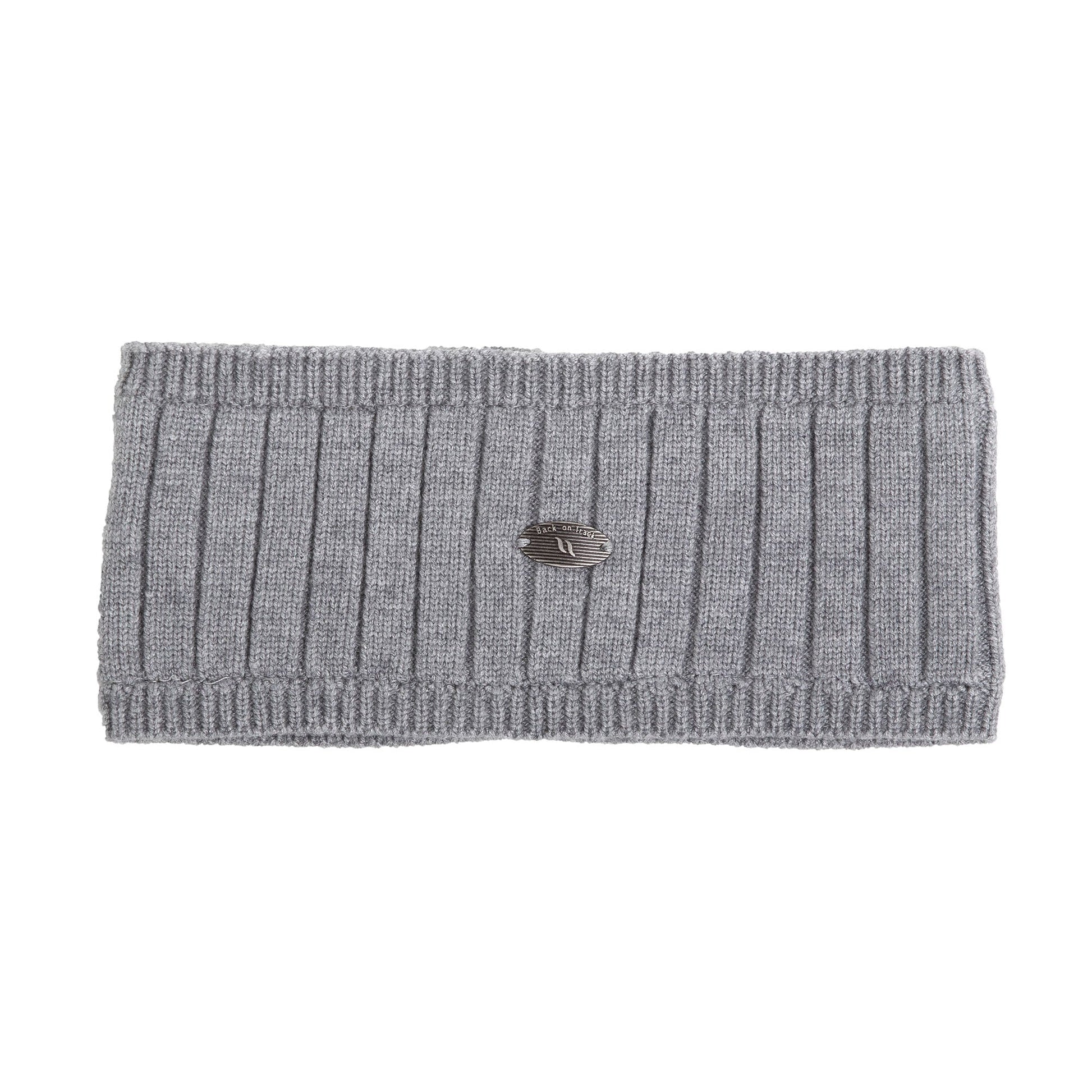 Pannbandet har en snygg ljusgrå melerad färg, och ett metallemblem på framsidan.