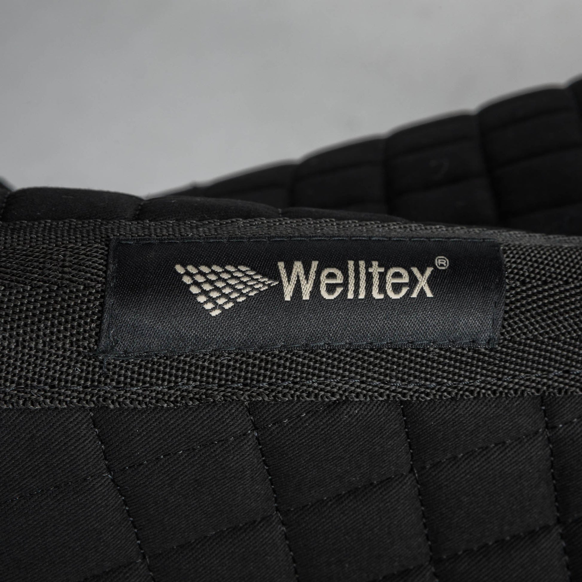 Stoppning av 600g ren bomullsfilt, och 200g Welltex®-filt som kontrollerar temperaturen och ger en god andningsförmåga. Vår textilteknologi Welltex® ger även schabraket förmågan att reflektera hästens kroppsvärme i form av infraröd energi (FIR), vilket har en djupverkande, terapeutisk effekt på muskler och leder.