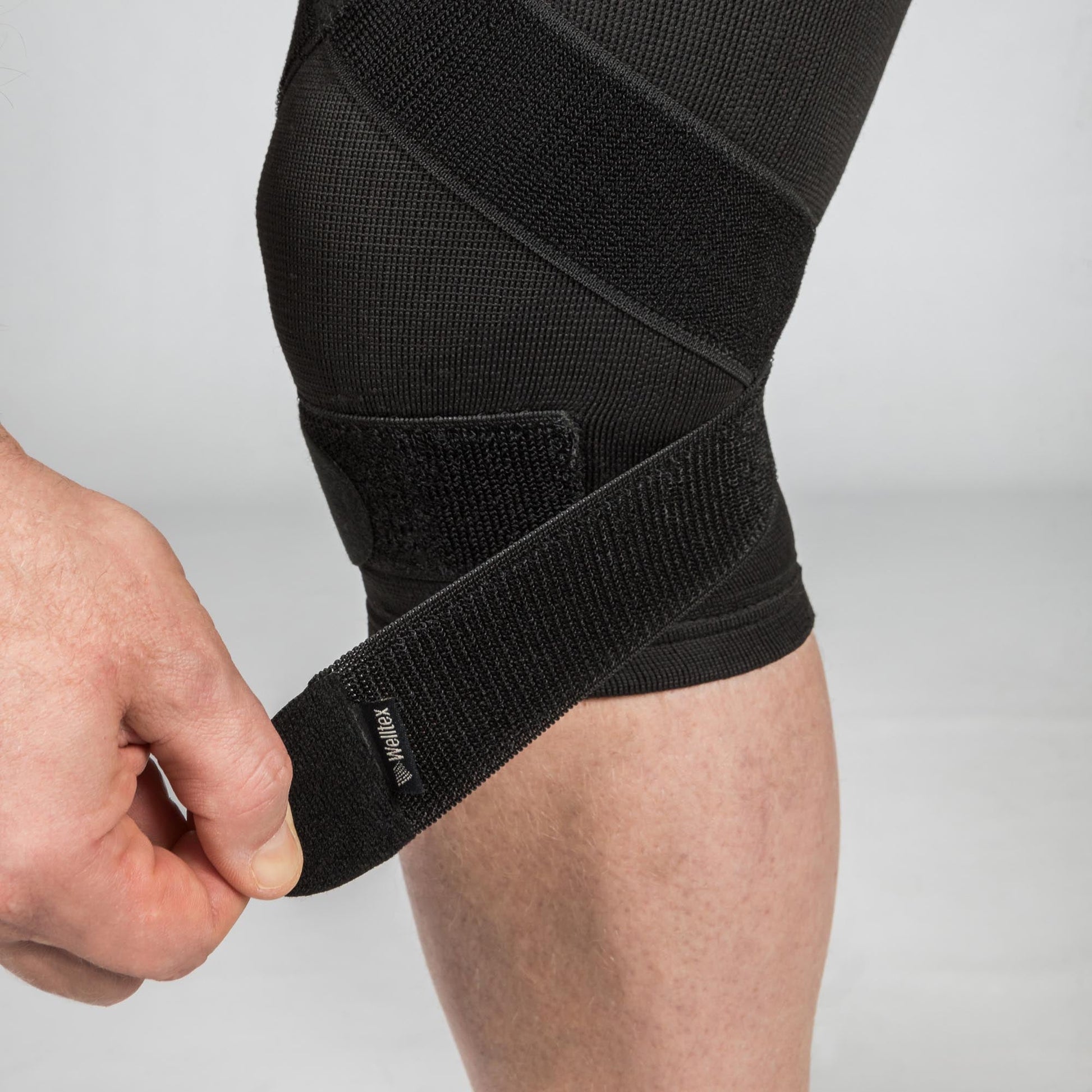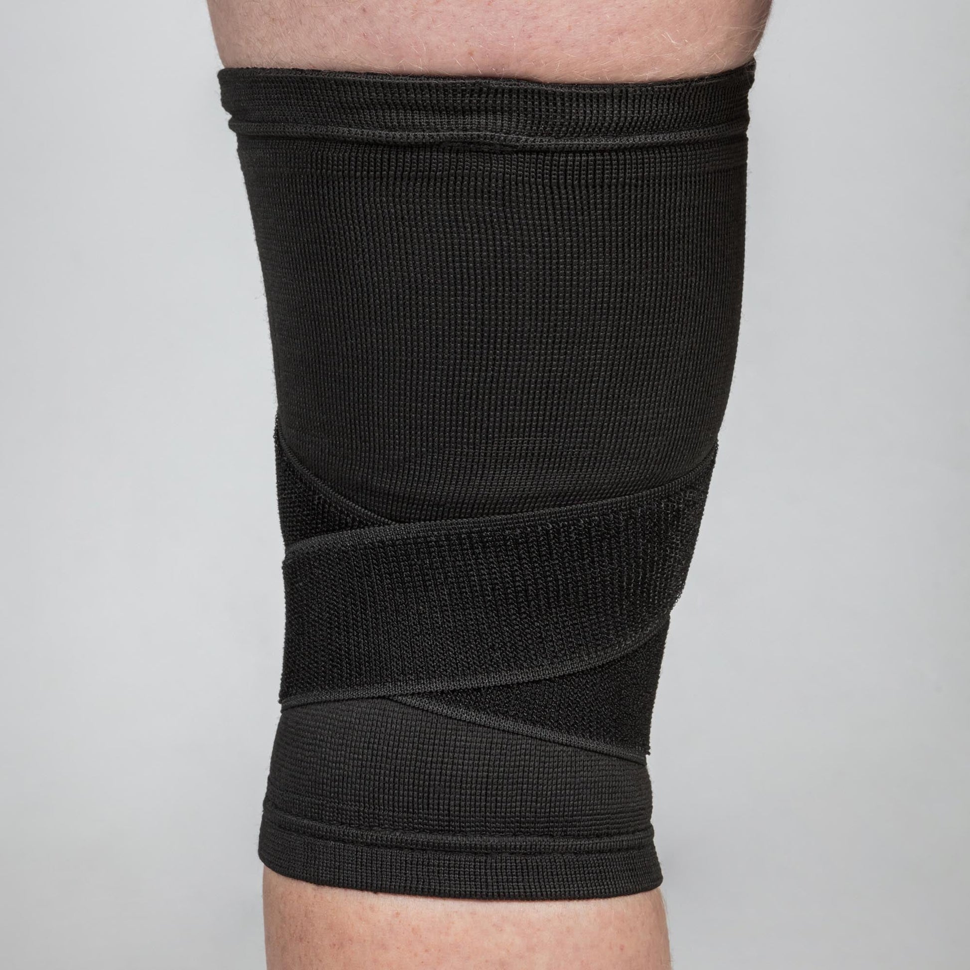 STRAPZ Knäskydd dras upp över knäet och justeras med kardborreband. Det är en okomplicerad produkt avsedd att lindra besvär i knäet och minska belastningen på omgivande muskler och senor.