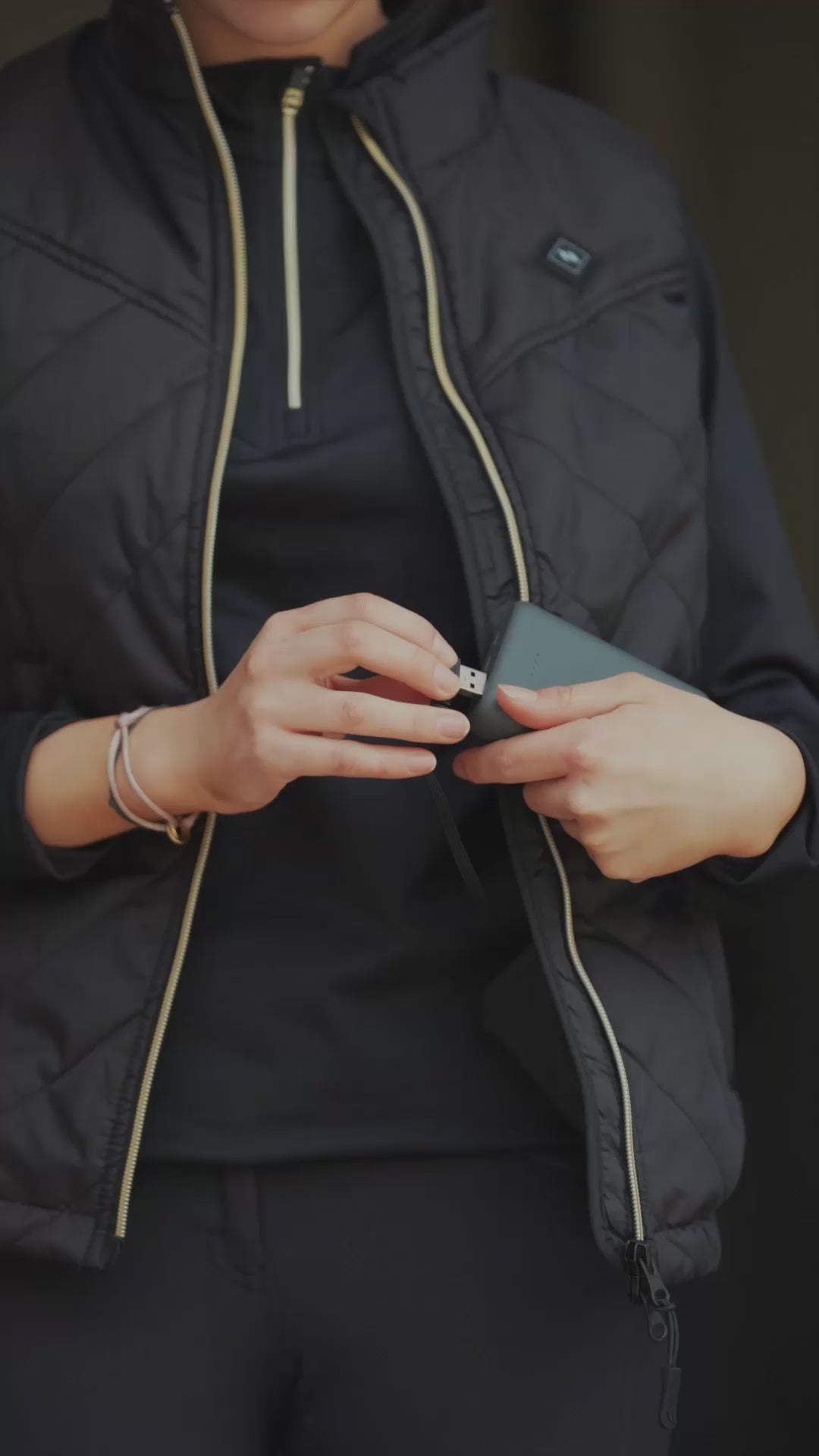 "Etna" är en lätt vadderad, eluppvärmd väst som ger dig omedelbar värme med ett knapptryck - när det passar dig och utan att du behöver kläder i flera lager. Det gör västen till ett perfekt plagg i kyligt väder, eller när du tar en paus och behöver hålla dig varm mellan träningspassen.